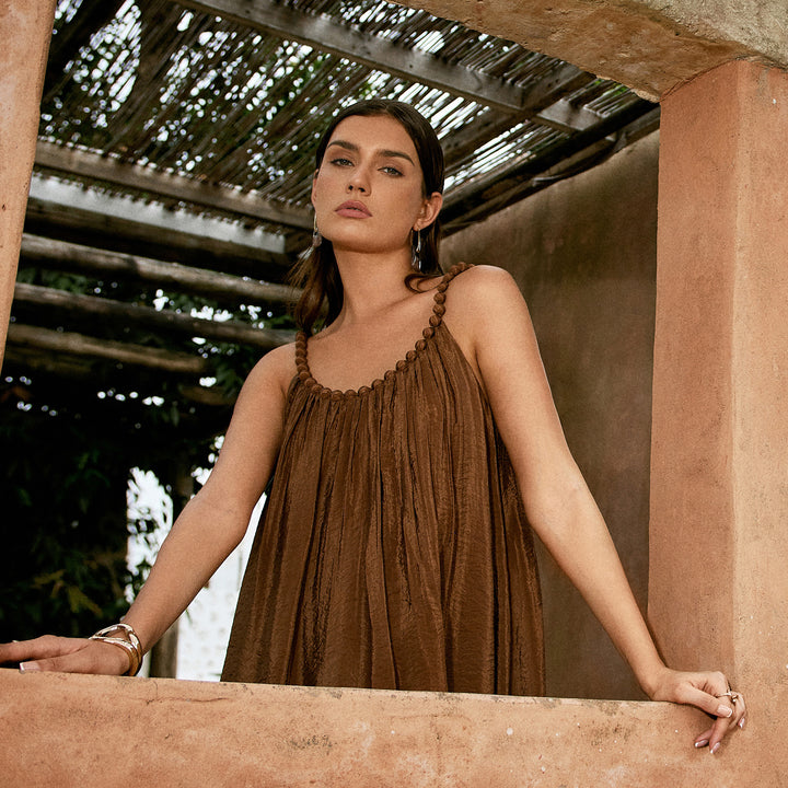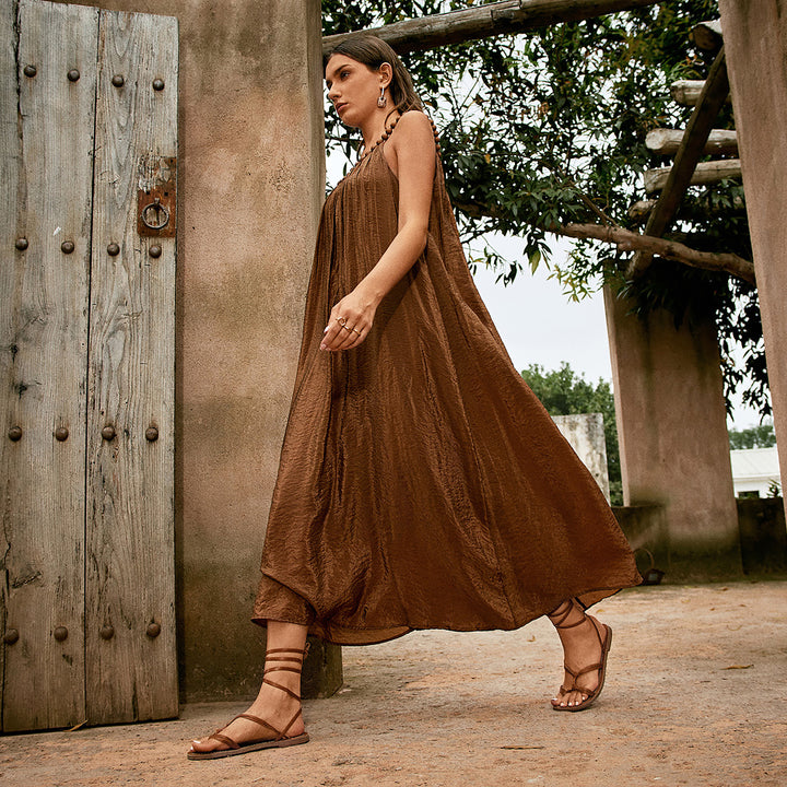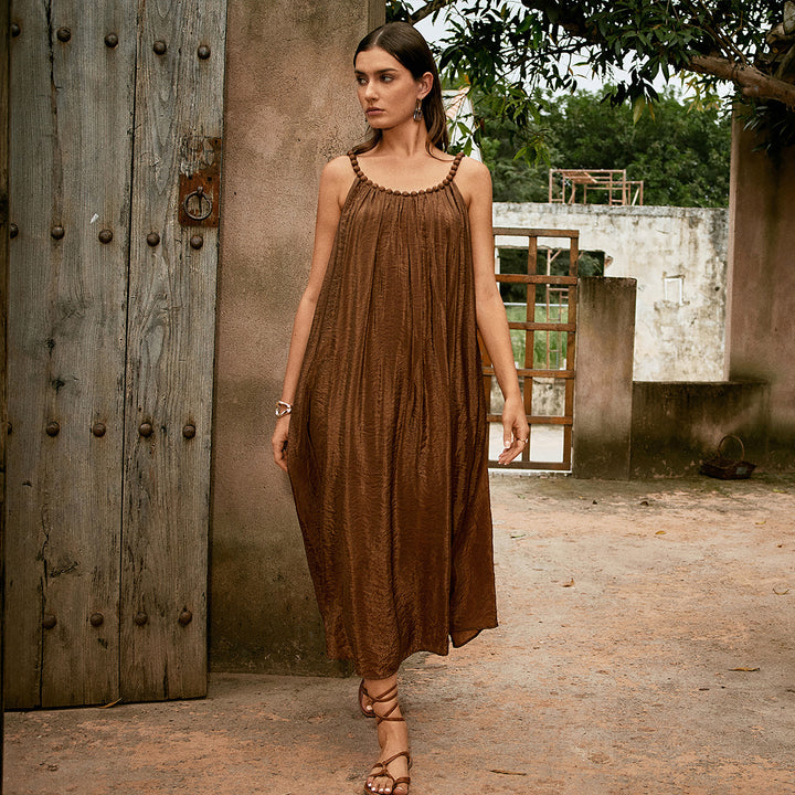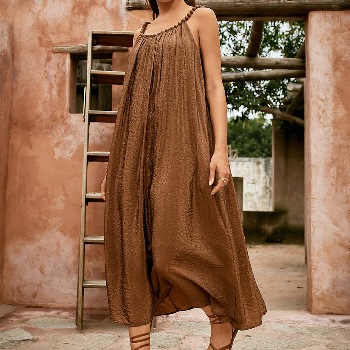 Vacation style 3D bead decorated pleated spaghetti strap maxi dress